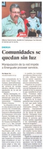 Diez comunidades de la zona rural Pacayá, Coatepeque, Quetzaítenango, se encuentran desde ayer sin servicio de energía eléctrica, debido a la manipulación de la red de Energuate.