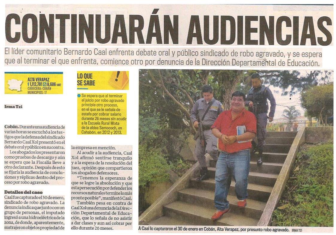 Continuarán audiencias Posted on 26 septiembre, 2018Categories Noticias Nacionales Nuestro Diario, página 1 El líder comunitario Bernardo Caal enfrenta debate oral y público sindicado de robo agravado, y se espera que al terminar el que enfrenta, comience otro por denuncia de la Dirección Departamental de Educación. Cobán. Etiquetas: Prensa