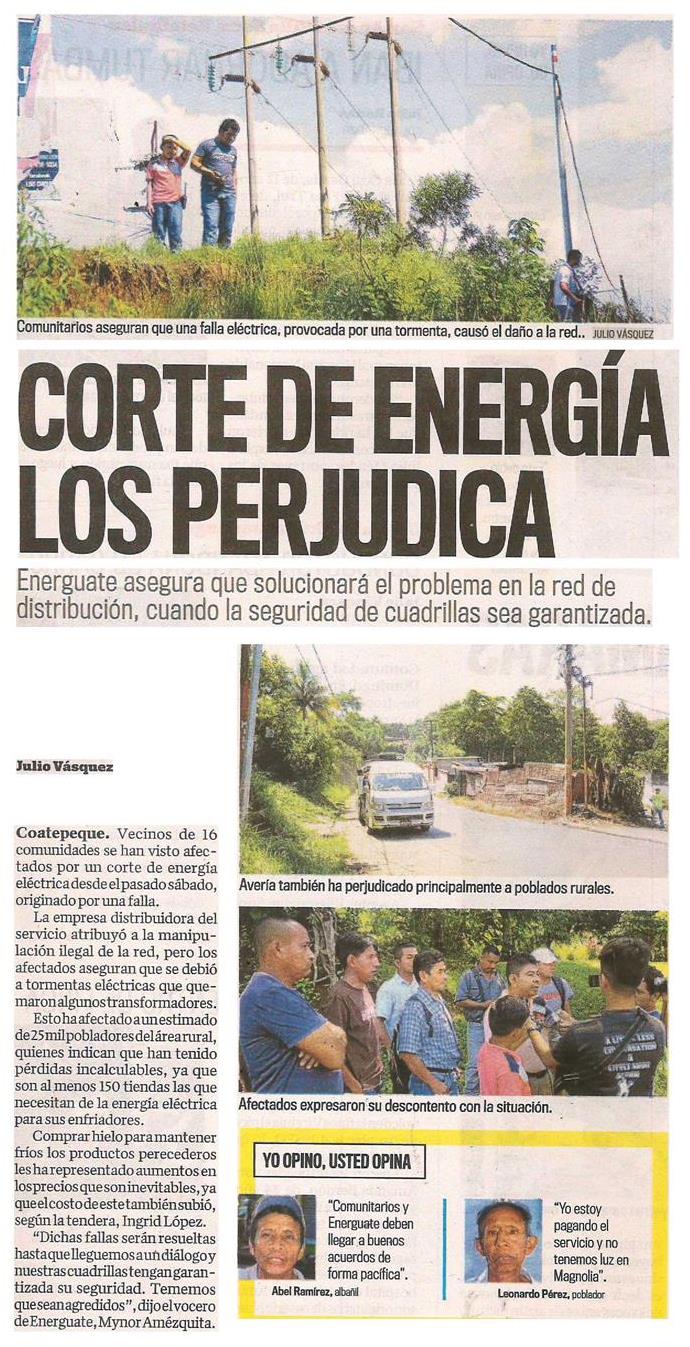 Corte de energía eléctrica los perjudica Posted on 1 noviembre, 20182 noviembre, 2018Categories Noticias Nacionales Nuestro Diario, página 15 Energuate asegura que solucionará el problema en la red de distribución, cuando la seguridad de cuadrillas sea garantizada. Coatepeque. Etiquetas: Prensa