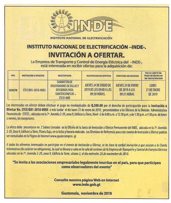 Invitación a ofertar Posted on 6 noviembre, 2018Categories Avisos Prensa Libre, página 35 INVITACIÓN A OFERTAR. La Empresa de Transporte y Control de Energía Eléctrica del -INDE-, está interesada en recibir ofertas para la adquisición de… Etiquetas: Prensa