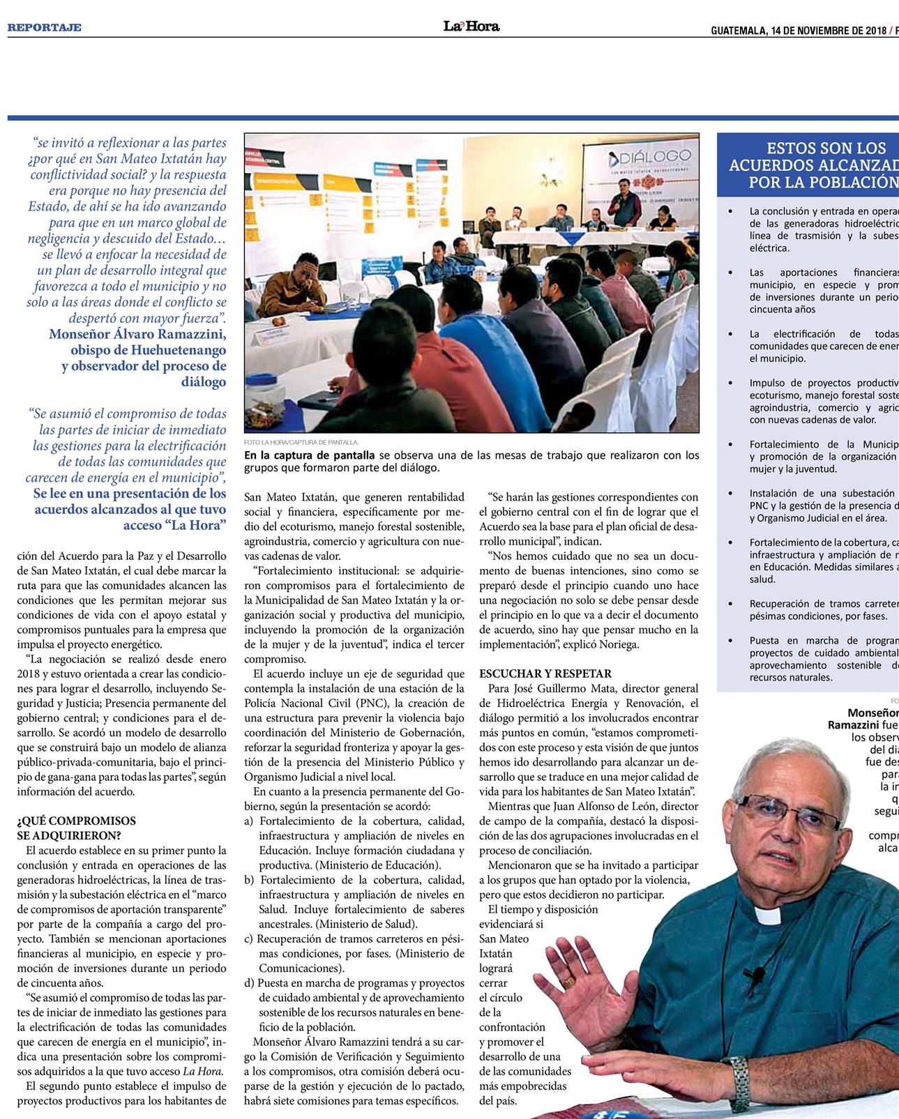 Lo que empezó con un conflicto originado aparentemente por la presencia de una hidroeléctrica evolucionó en un diálogo que, según comentaron quienes participaron, permitió la identificación de problemas estructurales que necesitan ser atendidos y ello derivó en un compromiso entre pobladores, la empresa responsable del proyecto y observadores para buscar el desarrollo de un municipio olvidado por el Estado.