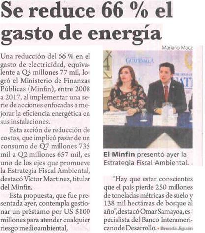 Una reducción del 66 % en el gasto de electricidad, equivalente a Q5 millones 77 mil, logró el Ministerio de Finanzas Públicas (Minfin), entre 2008 a 2017, al implementar una serie de acciones enfocadas a mejorar la eficiencia energética en sus instalaciones.