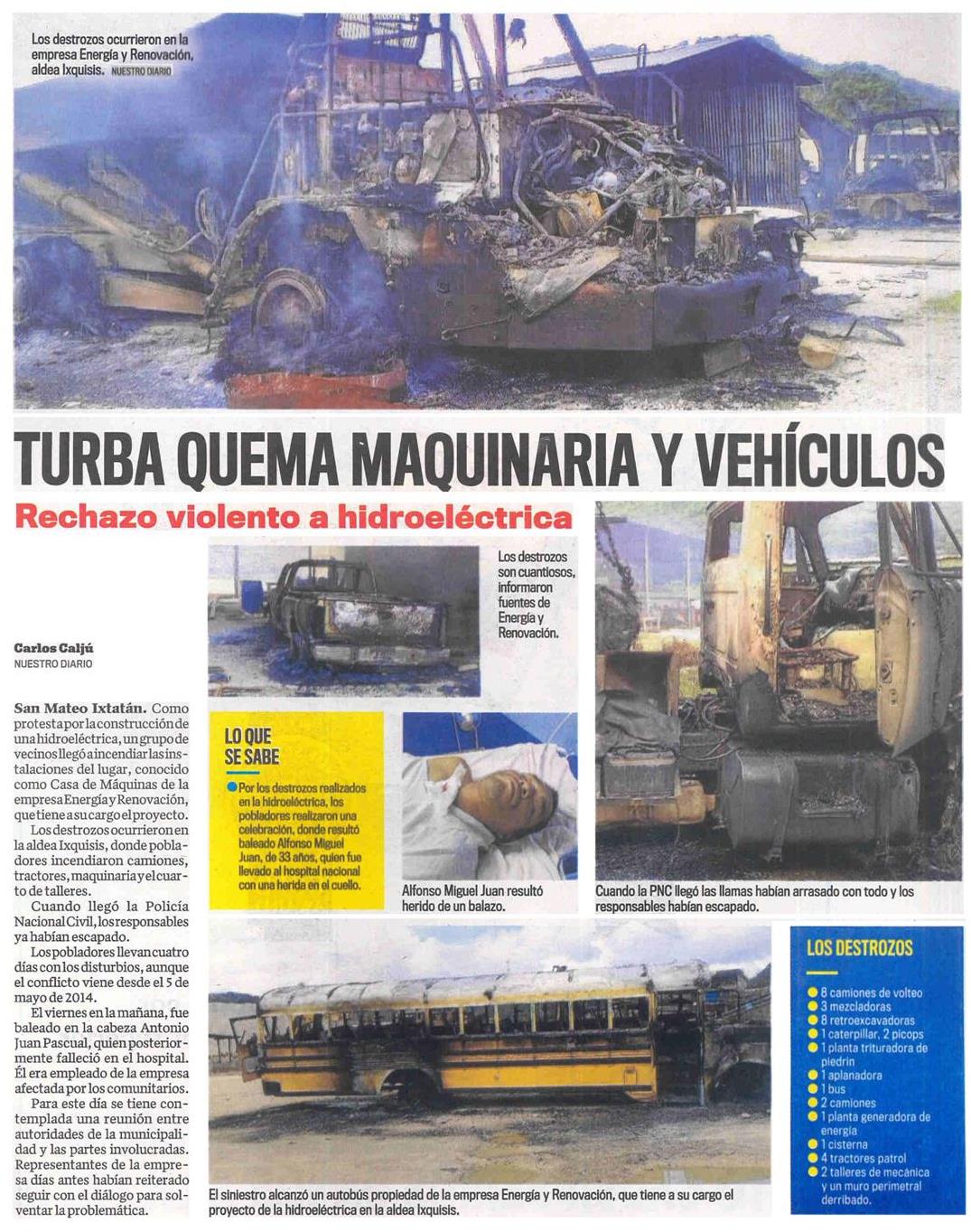 Turba quema maquinaria y vehículos Posted on 15 octubre, 2018Categories Conflictividad Nuestro Diario, página 14 Como protesta por la construcción de una hidroeléctrica un grupo de vecinos llegó a incendiar las instalaciones del lugar, conocido como Casa de Máquinas de la empresa Energía y Renovación, que tiene a su cargo el proyecto. Etiquetas: Prensa